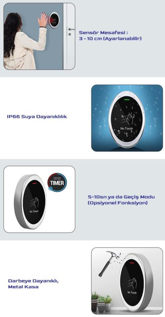 *No-Touch Buton IP66 standardı ile su geçirmez özelliğe sahiptir. Düğmeye fiziksel olarak dokunmadan sadece yaklaştırarak kapının açılmasını sağlayabilirsiniz. Alümünyum Alaşım Kasa, NO / NC / COM Çıkış Sinyali, 3 ~ 10cm Sensör Mesafesi, 5s -10s veya Geçiş Modu, 10 ~ 24V DC Çalışma Voltajı L105 x W69 x H20 mm