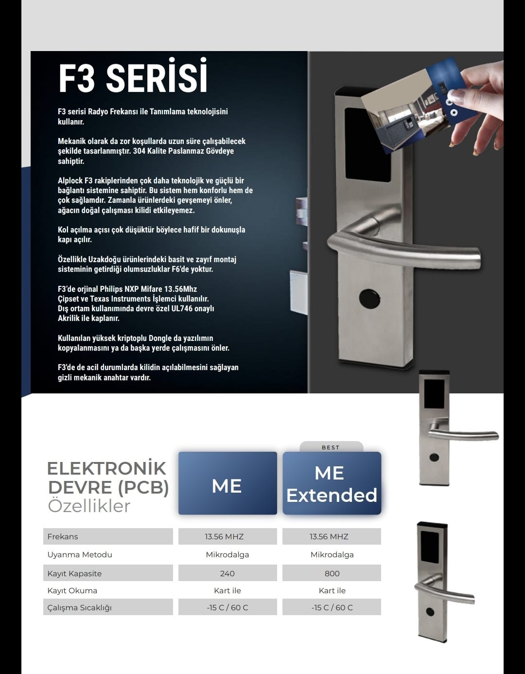 Gövde / Kilit Özellikleri Paslanmaz Çelik Gövde. Birçok kol seçeneği. Dış ortam için opsiyonel PVD Kaplama Stabil kullanımı garanti altına alan özel montaj sistemi. Güçlendirilmiş tasarım *120 dk yangına dayanıklı kapılara uygundur. CE, FCC, ISO Sürtünme ve ses önleyisi dil. Rahatsız etmeyin fonksiyonu ve Tek hamlede çıkış özeliği Araya girme (hırsızlık önleme) dili. Standard German Barel, Göbek. Mekanizmasında plastik içermez. Sistem Özellikleri ISO/IEC 14443 Teknolojisi Stabil ve Doğru Kart Okuma Uzun pil ömrü. Mikrodalge uyanma teknolojisi Texas Instruments/Atmel İşlemci Teknolojisi ISO Kart, etiket kart, bileklik ve anahtarlıkla çalışabilir. 30mm çapındaki kağıt etiket kartı bile okuyabilir. Kartı cüzdan içinden okuyabilir 4 adet Alkalin pil AAA pile ile yaklaşık 2 yıl çalışır. Hem ışıklı hem de sesli uyarılar verebilir. Hafızası silinmez. Son 240 (opsyionel 980) kaydı saklar. Mekanik açılmayı da kayıt eder. Sınırsız master kart ve gruplama kombinasyonu vardır. Max 65.000 oda. Windows XP/7/8 ve Windows 10 ile uyumludur. 32/64 bitlerde çalışır. Ağ yapısında üretilmiştir. MSSQL veritabanı kullanır. İstemci( Client ) – Sunucu (Server ) mimarisi ile sınırsı resepsiyon/kodlayıcı bağlanabilir.