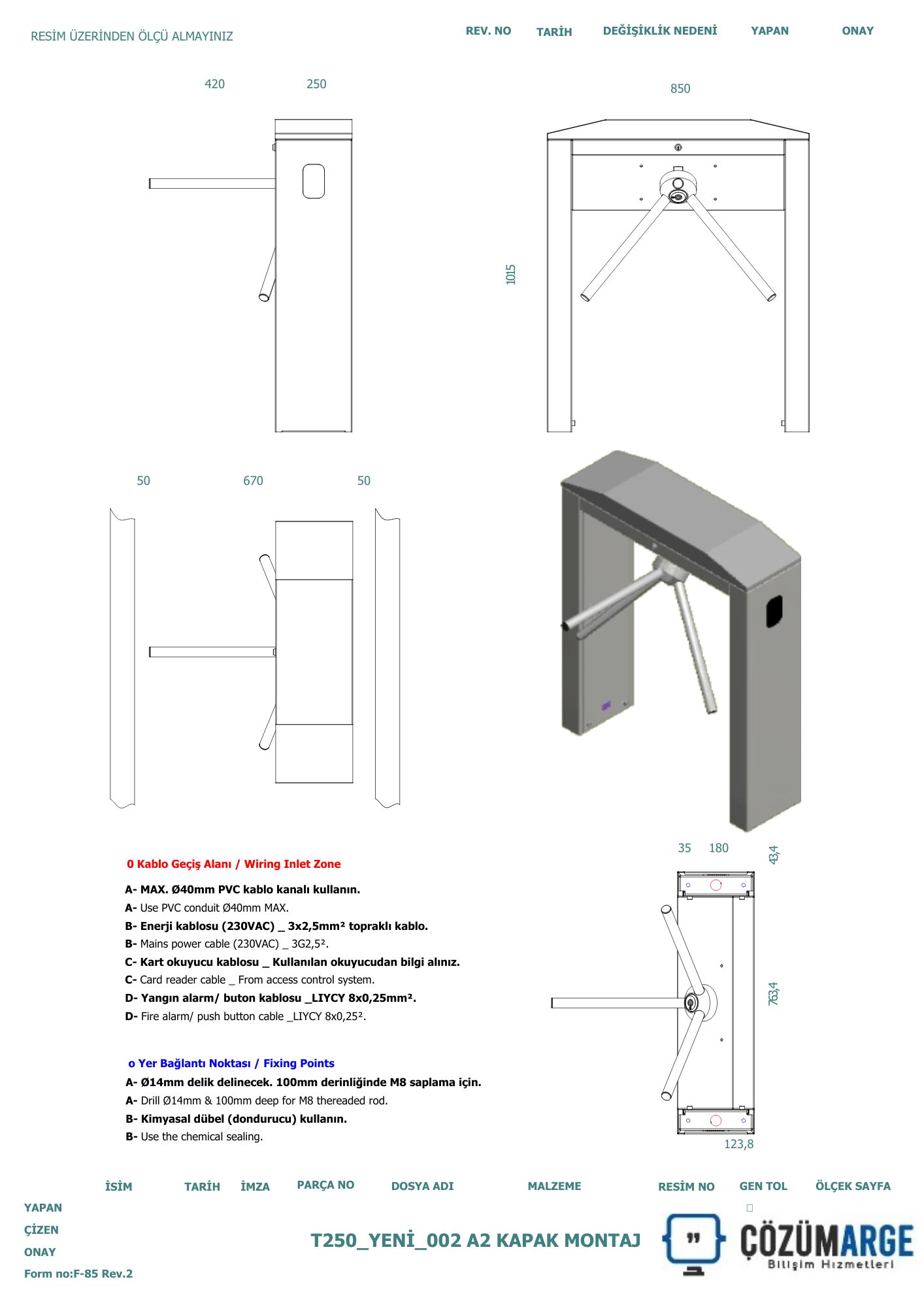 T250 A2 Çift Ayaklı Paslanmaz Turnike Teknik Cizim jpg İndir